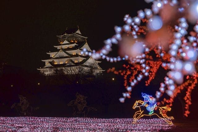 大阪府の大阪城公園・西の丸庭園にて、約350万球のイルミネーションで彩られる「大阪城イルミナージュ」が開催されます。2024年度のテーマは「大阪歴史イルミネーション ~将軍と侍の世界へようこそ~」。ドラマ「将軍」の舞台である大阪城を中心に、戦国時代から現代を表現する大規模な展示が展開されます。日本初の和のイルミネーションや、実際に存在する兜をモチーフにした作品、全身の侍武者や当時の船を再現した展示が特徴です。